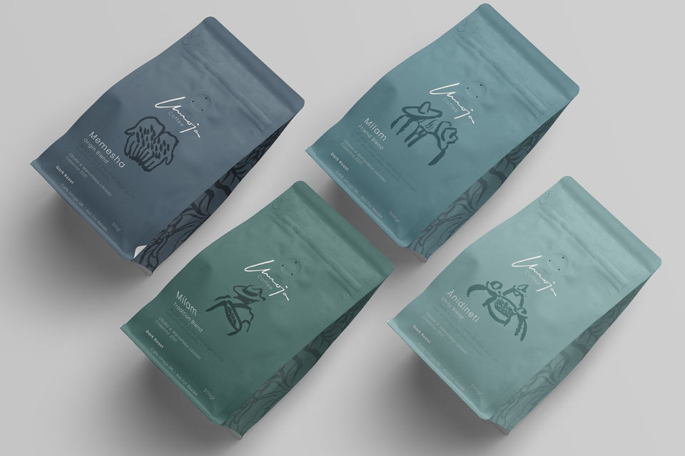Für Umoja Coffee SRL in Costa Rica das gesamte Design, von Logo, zu Illustrationen, zu Kaffee-und Schokolade-Verpackungen gestalten zu dürfen ist mir eine grosse Ehre. Es macht mir unglaublich spass, mit moderner Sans-serif Typografie und verspielten, handgezeichneten Tusche-Illustrationen verspielte Designs zu erschaffen.